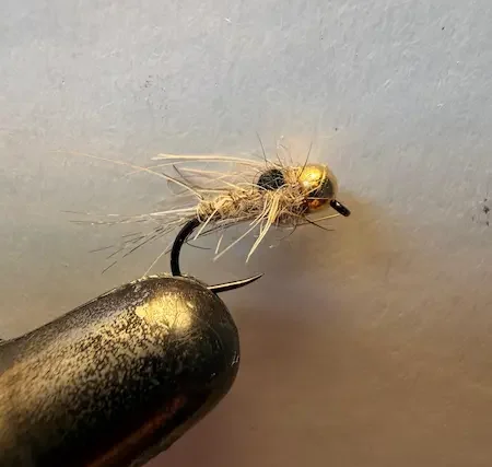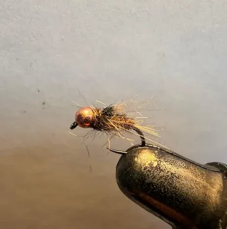 • Montaje:Anzuelo 12-18. Cabeza de tungsteno. Cuerpo de dubbing natural de liebre (mezcla de pelo suave y rígido). Segmentación con hilo de cobre.