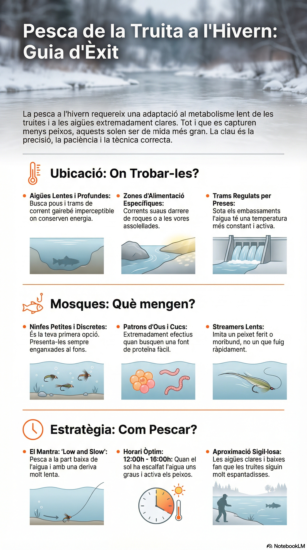 - La regla “Low and Slow”: Aquest és el mantra de l’hivern: pesca a la zona baixa de la columna d’aigua i amb una deriva molt lenta. Les truites estan letàrgiques i necessiten que la mosca els passi gairebé pel davant del nas.