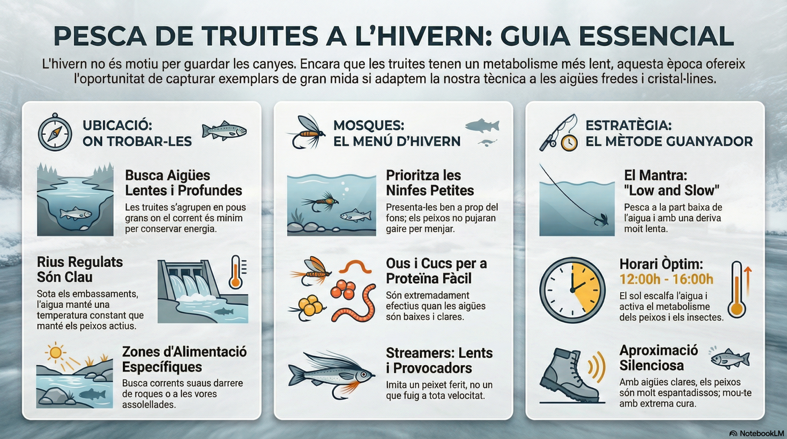 La clau per a pescar truites a l’hivern és adaptar-se a un metabolisme més lent i a unes aigües extremadament clares.